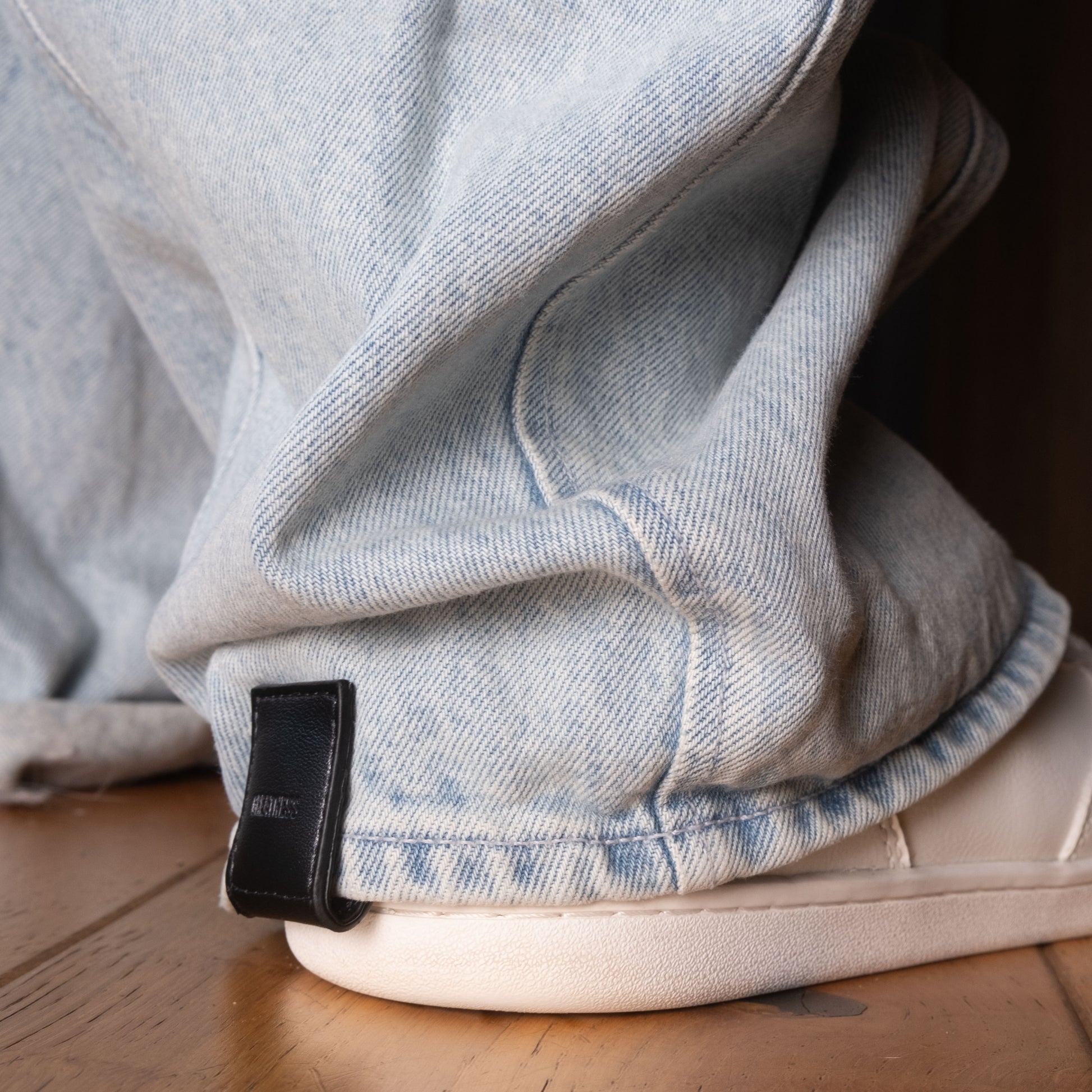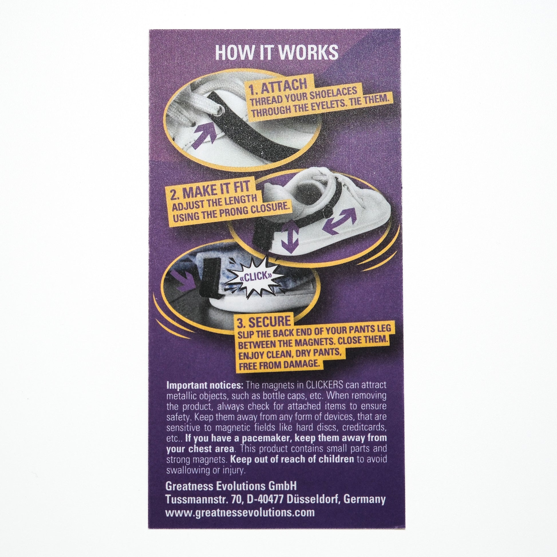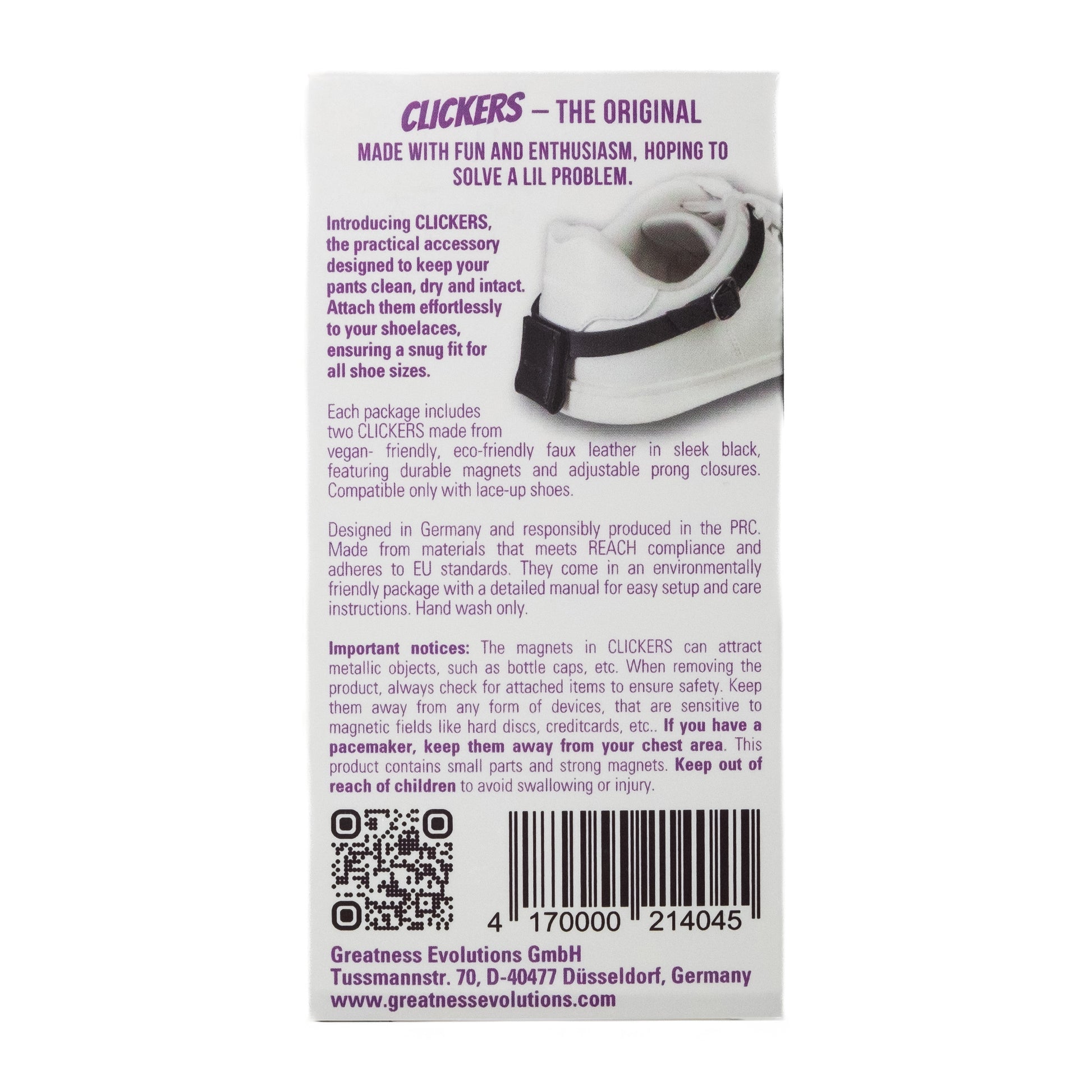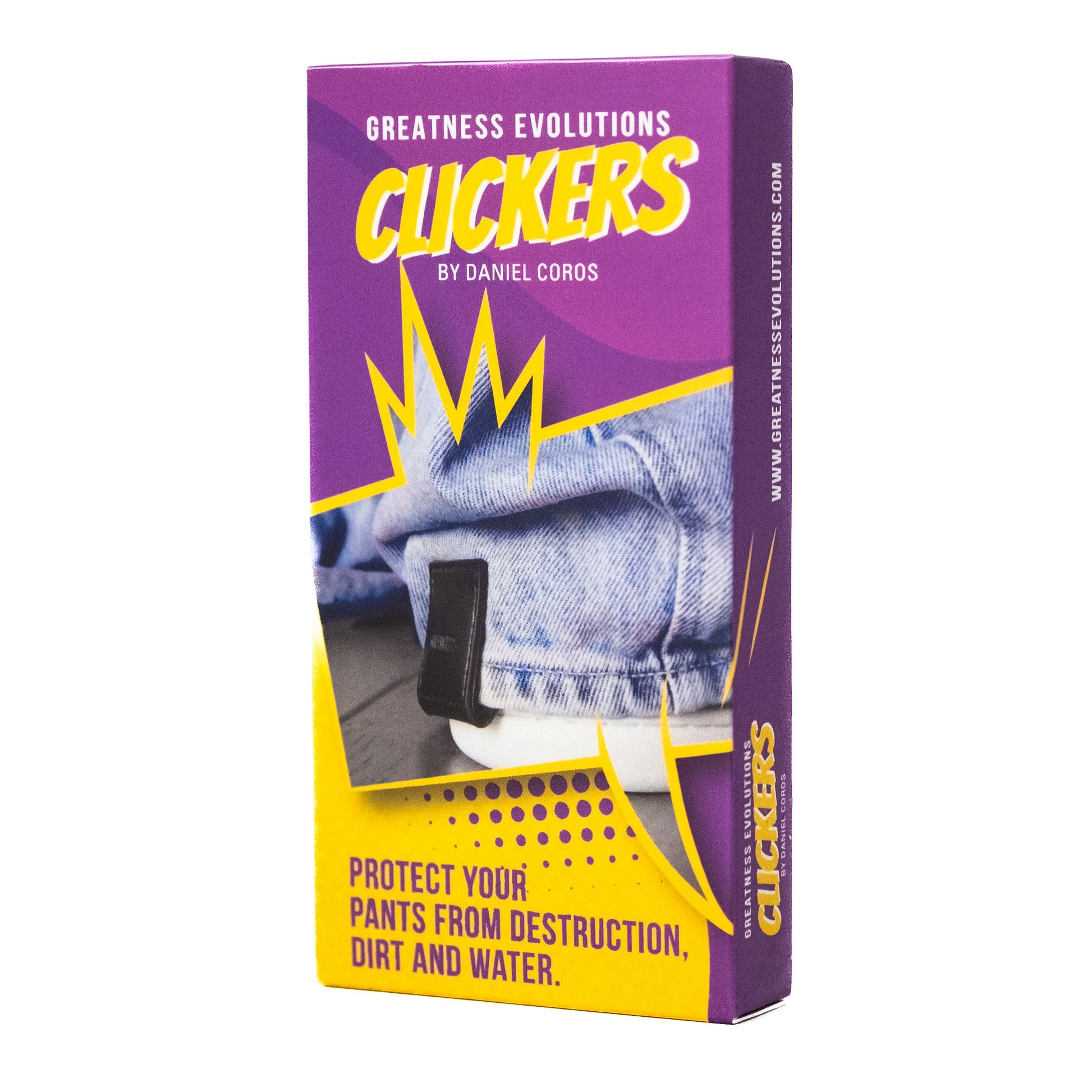 Clickers sind der Style-Hack, den dein Fit gebraucht hat. Schwarze, magnetische Pantsguards aus synthetik-Leder, die du an dein Schnürsenkeln befestigst und die mit einem "Click" deine Hosenenden fixieren. So gut.